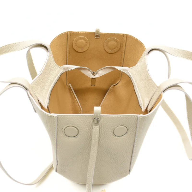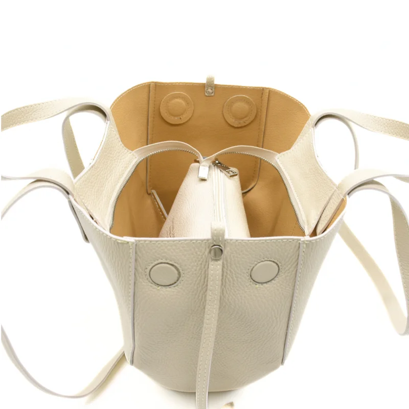 On each side of the Mag Beige Leather Handbag, there are two magnetic pieces that help keep it in shape.